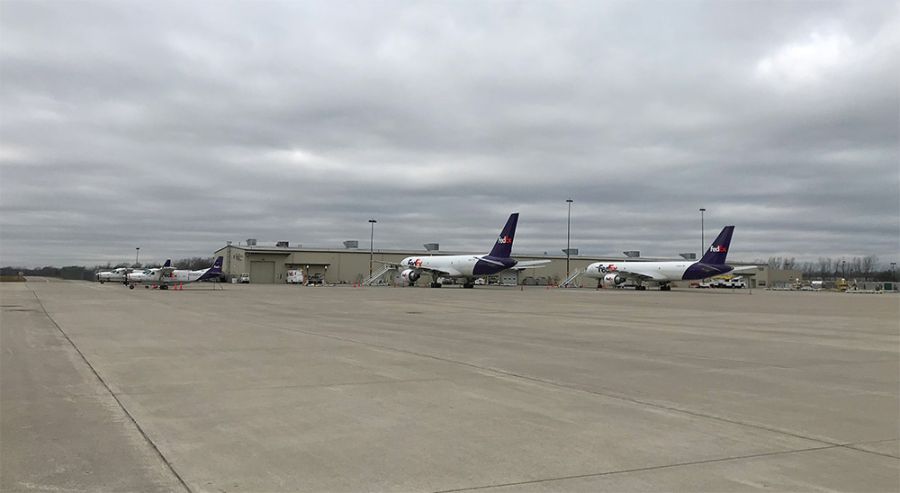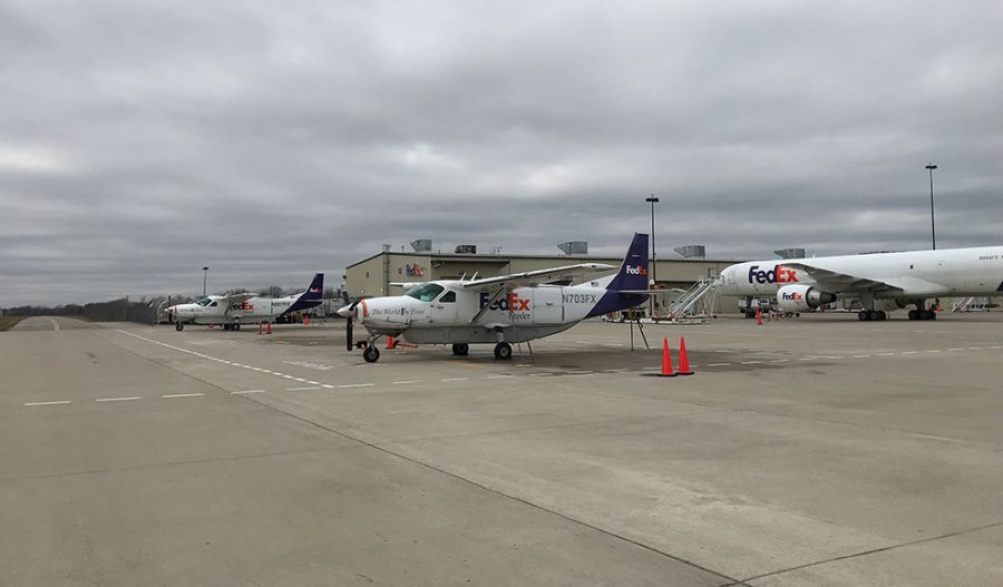 Two FedeX planes sitting on the tarmac at Flint Bishop airport.